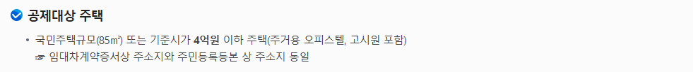 - 전용면적 85㎡ 이하 또는 기준시가 4억 원 이하의 주택.