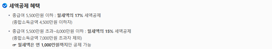 - 총급여 5,500만 원 이하: 월세액의 17% 세액공제.