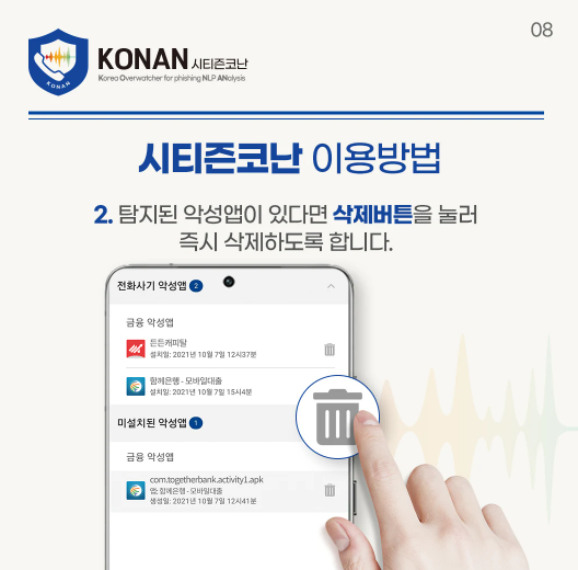 보이스피싱 사전 차단, 스마트폰에 꼭 필요한 보안 필수앱이 있습니다.보이스피싱과 스미싱 범죄가 날로 지능화되고 있는 요즘 일선 경찰 요청으로 탄생한 시티즌 코난 앱은 스마트폰을 통한 금융사기 피해를 실시간으로 막아주는 강력한 방패입니다. 악성앱 실시간 탐지 기능과 스미싱 문자 자동 차단, 원격제어앱 차단 기능을 통해 많은 피해를 사전에 차단해주고 있습니다.
