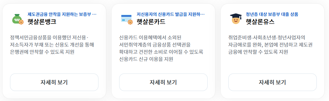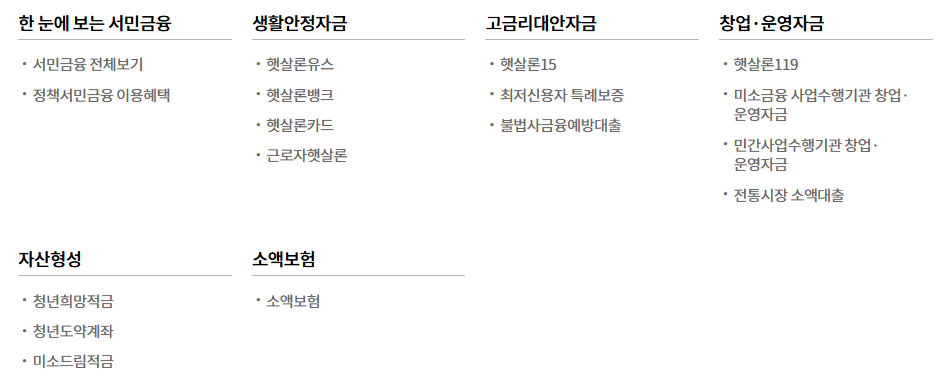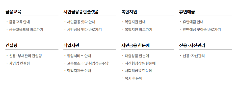 서민금융상품(근로자햇살론, 햇살론15, 햇살론유스, 미소금융), 서민생활지원, 휴면예금 지급서비스 제공