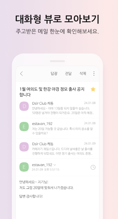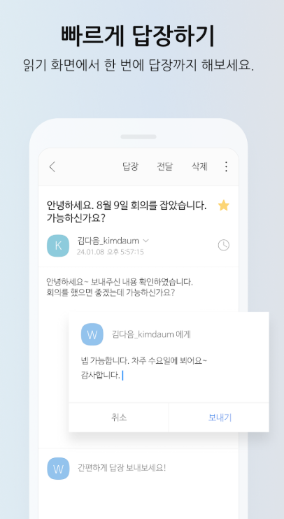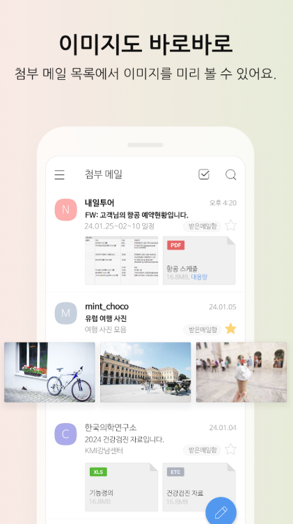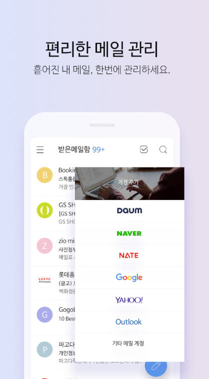 앱 하나로 모든 메일 관리 끝! Daum 메일 뿐 아니라 네이버, 구글 메일까지 연결해 쓸 수 있습니다! 지금 바로 설치해 보세요.