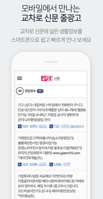 교차로 신문그대로보기 기능을 활용하면, 광고를 지면 전체로 비교하면서 같은 업종의 조건을 한눈에 파악할 수 있어 비교 후 가장 현실적인 조건을 선택할 수 있습니다.