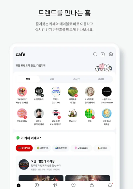 - 다음 카페 앱에서는 내 카페 탭을 통해 내가 가입한 모든 카페를 한 번에 확인하고 바로 접속할 수 있다.